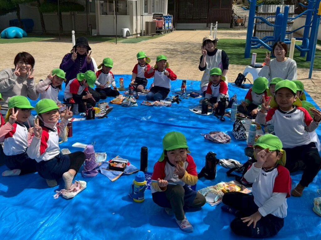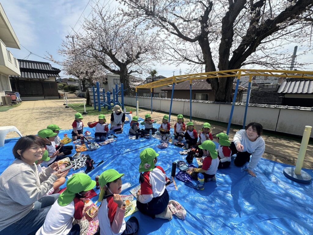 お花見弁当 ぞう組 桜が九分咲き 一気に開いたおかげで、お花見日和となりました。 お給食の先生、美味しいお弁当ありがとうございます。 おうちのかたも、大きいお弁当にごはんを入れて下さりありがとうございました